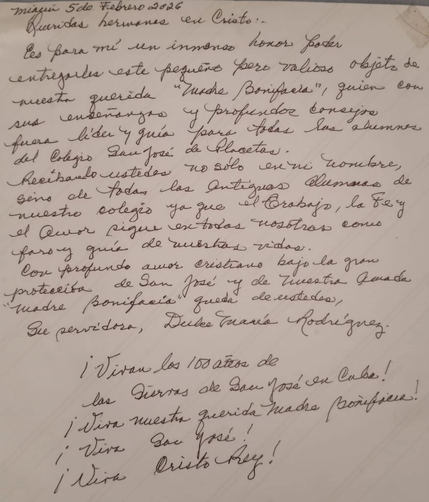 El sábado 7 de febrero, en la ciudad de Miami, vivimos un encuentro cargado de emoción, gratitud y recuerdos entre exalumnas del Colegio «San José» de Placetas, Cuba, y Siervas de San José. La ocasión estubo enmarcada en la celebración de los 100 años de presencia de la Congregación en Cuba.